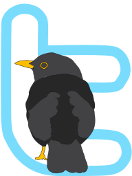 To the right are various images that marked the steps along the way to the roll-over icon. The first is my freely-pirated image of a blackbird, whose beautiful eye and beak provided the original inspiration for the design. My drawing (traced from the picture) was arguably too pretty when Dossy told me he was looking for something fun that included the Twitter "t", so I reworked the idea to have a slightly enigmatic bird who goes a little mad when you roll over him.
